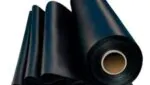 Uma imagem de um rolo de lona ou PVC preto, parcialmente desenrolado, com o final da lona pendurado para fora.